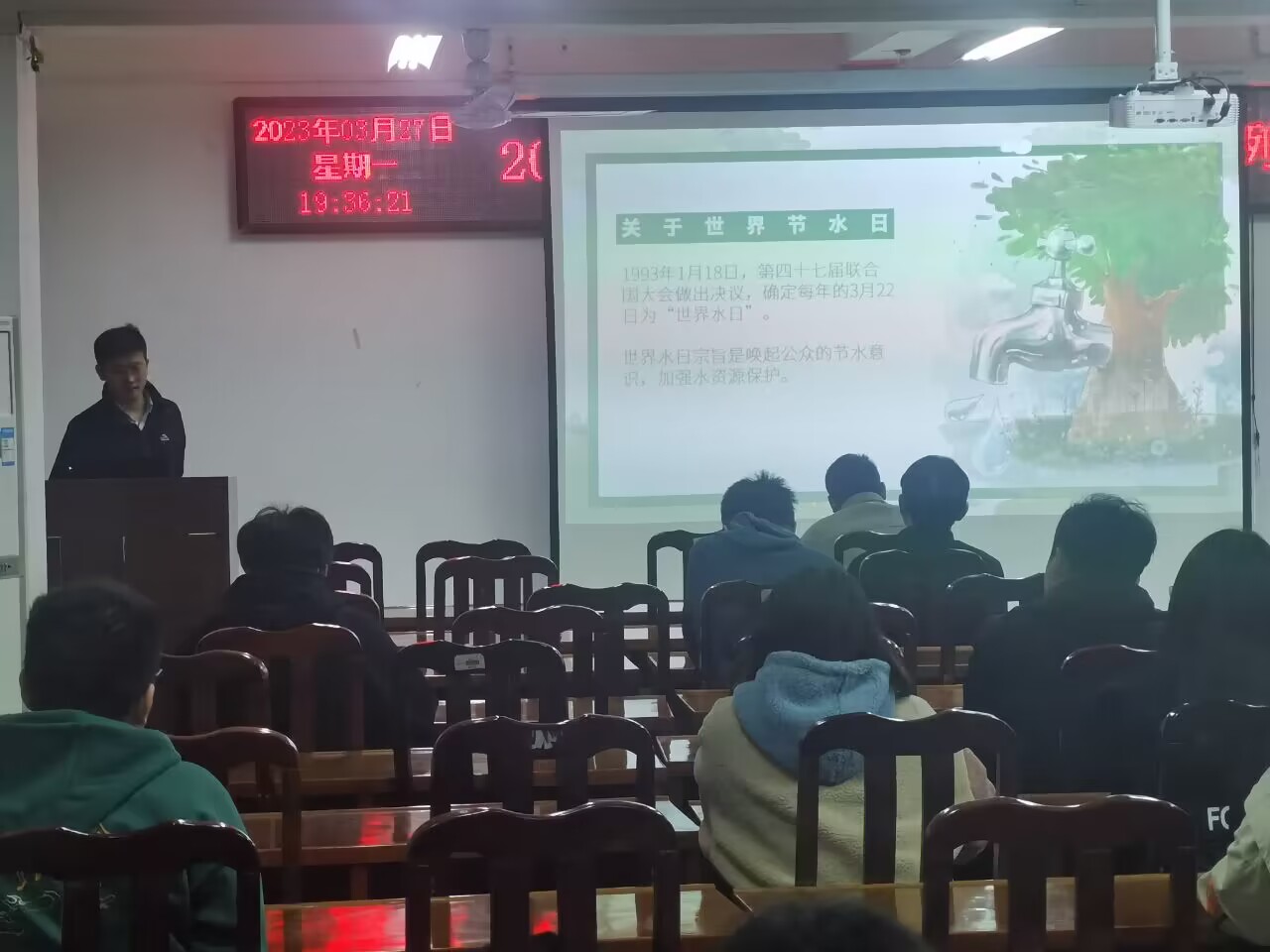 3月27日,我院辅导员叶景胜于黄金校区逸夫楼第二会议室召开了以“节水中国,你我同行”为题的主题会议,学院各班级学生代表参与了会议。会上,与会人员学习了地球水资源现状、节水的意义等相关知识,并就如何节水以及如何养成节约用水的习惯等问题展开了讨论。