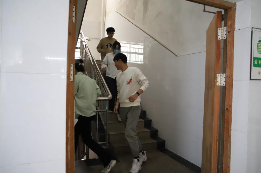 演练所有参加人员在办公、上课、学习、实验一切如常。随着警报响起,各楼层指挥员立即跑至每个房间并指挥全体人员迅速有序的离开房间在有序指挥下,老师和同学们纷纷迅速弯腰、靠墙、捂住口鼻,严格按照正确的逃生姿势从东面楼梯靠右有序下楼到空地处集合,到达安全地区随后各指挥员在逸夫楼1楼东面安全出口外的排球场清点人数。