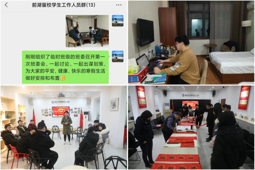 在江西理工大学,受疫情影响而选择留校过年的学生大约有80余人,为了缓解留校生的焦虑和孤独感,学校专门准备了“留家庄”,临时组建了留校宿舍。为了让留校生也能过个暖心年,学校开展了“五暖”活动:一是“暧心”,向留校过年学生发放爱心补助和春节生活礼包;二是“暖情”,开展共度一次年夜饭、看一场春晚、贴一副春联、包饺子等活动;三是“暖学”,开放学习场所、组织寒假读书活动;四是“暖行”,发放防疫大礼包;五是“暖身”,开放部分室内外体育锻炼场所,鼓励大家积极运动。