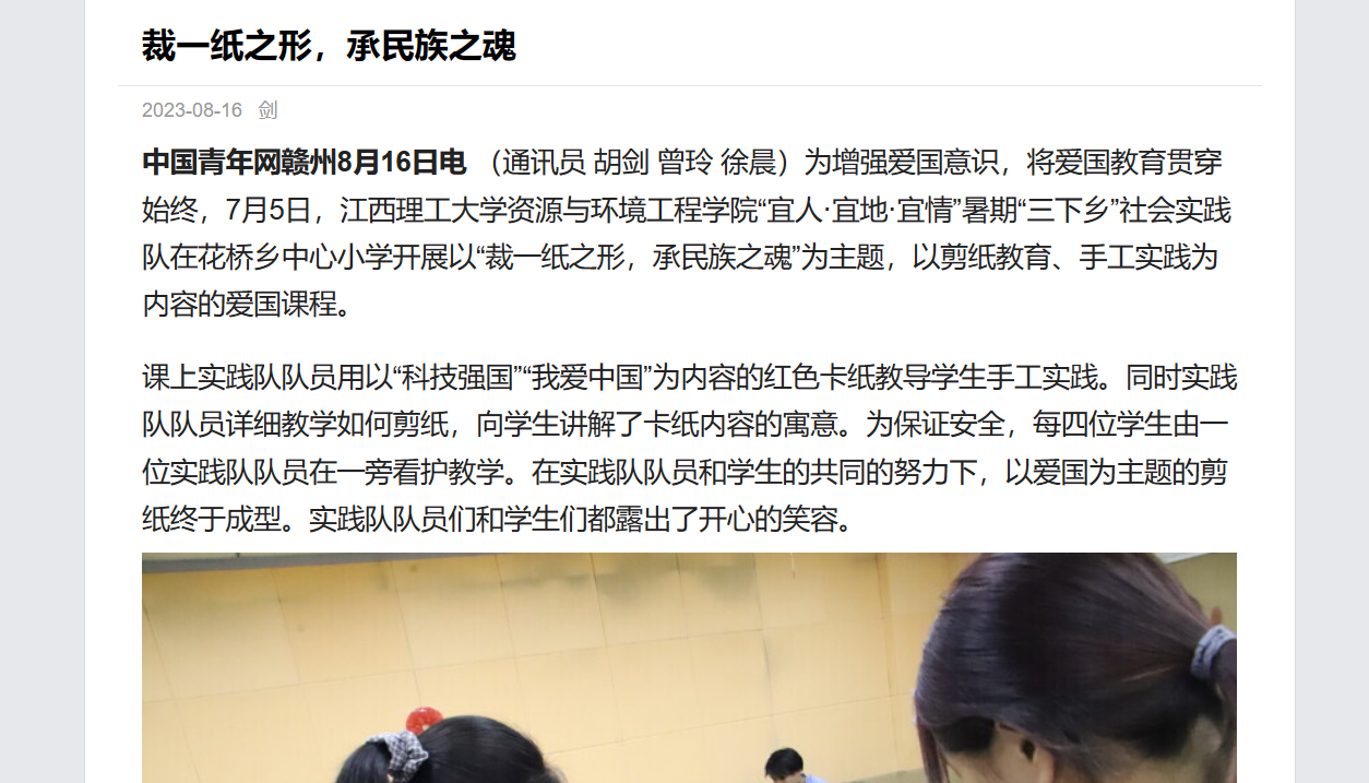 中国青年网赣州8月16日电 (通讯员 胡剑 曾玲 徐晨)为增强爱国意识,将爱国教育贯穿始终,7月5日,im真人网站“宜人·宜地·宜情”暑期“三下乡”社会实践队在花桥乡中心小学开展以“裁一纸之形,承民族之魂”为主题,以剪纸教育、手工实践为内容的爱国课程。