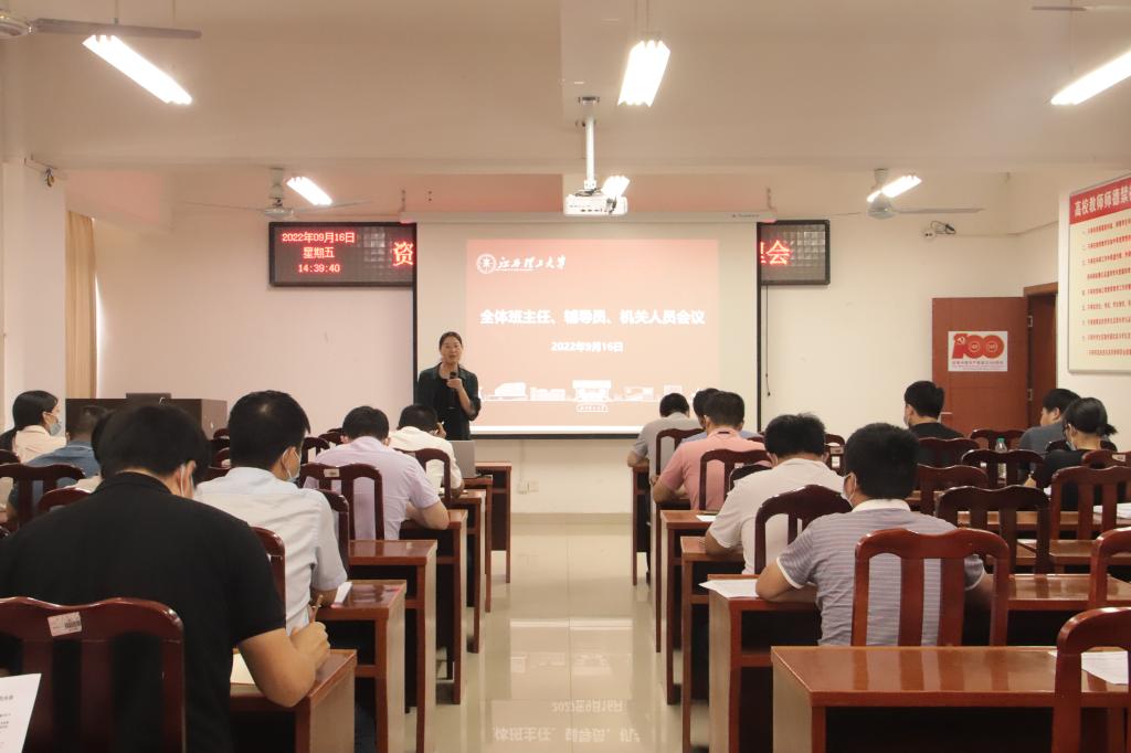 本网讯 9月16日下午,我院召开学生教育管理会议,会议以线下+线上的形式进行,主会场设在黄金校区逸夫楼第二会议室。我院院长何桂春、党委书记陈明、党委副书记饶先发、副院长陈飞以及全体班主任、辅导员和机关人员参加了本次会议。会议由饶先发主持。