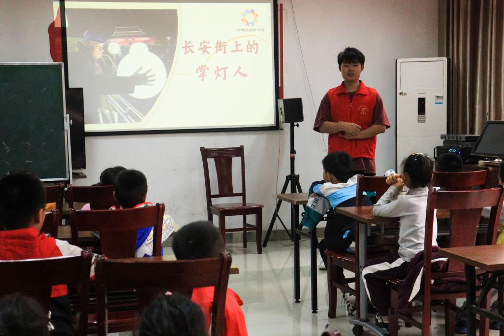 志愿者首先播放团中央“伙伴领航”青少年政治引领公开课《长街上的掌灯人》向孩子们展示了那些给予别人光明、赋予别人力量却不求回报、默默付出的人。同时提问的方式来引发孩子们对相关人物的联想,从而培养孩子们的奉献精神,爱国主义情怀