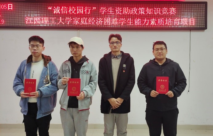 为积极宣传党和国家的学生资助政策与成效,普及金融基础知识,培养大学生的诚信意识和观念,充分展示我院学生明德立信、自立自强、拼搏向上的青春风采,进一步营造诚信校园文化氛围,促使学生成为德才兼备、全面发展的人才。我院于2023年11月5日开展了“诚信校园行”学生资助政策知识竞赛活动(江西理工大学家庭经济困难学生能力素质培育项目)。