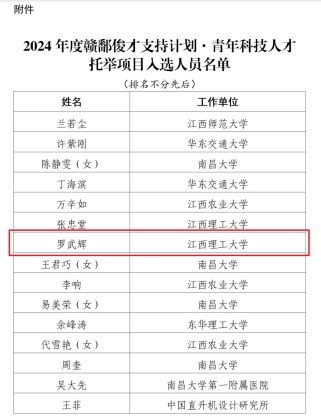 本网讯 6月11日,2024年度赣鄱俊才支持计划·青年科技人才托举项目入选人员名单公布,我院罗武辉副教授成功入选,这是我校首次获批该项目。