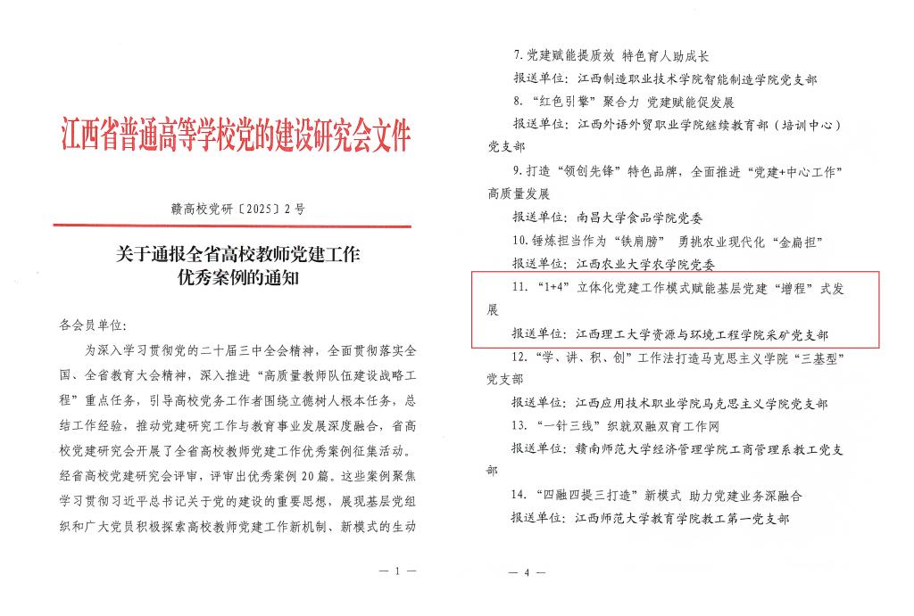 本网讯 1月9日,江西省普通高等学校党的建设研究会发布了《关于通报全省高校教师党建工作优秀案例的通知》(赣高校党研〔2025〕2号),我院采矿党支部的《“1+4”立体化党建工作模式赋能基层党建“增程”式发展》成功获评,全省仅20篇。