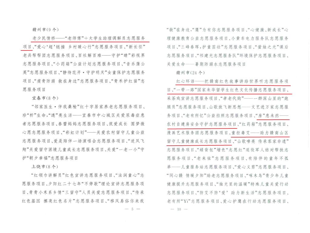 本网讯 近日,江西省文明办发布《关于首届江西省文明实践社会化志愿服务项目大赛结果通报》(赣文明办〔2023〕21 号),我校法学院“老少民情桥——‘老师傅’+大学生助理调解员志愿服务项目”喜获一类志愿服务项目;资源与环境工程学院“红心环语——把赣南红色故事讲给世界听志愿服务项目”和“童拒毒艾——助力赣南山区留守儿童健康成长志愿服务项目”、外国语学院“‘一带一路’国家来华留学生红色文化传播志愿服务项目”、土木与测绘工程学院“‘房’患未然——农村自建房安全守护志愿服务项目”喜获二类志愿服务项目。